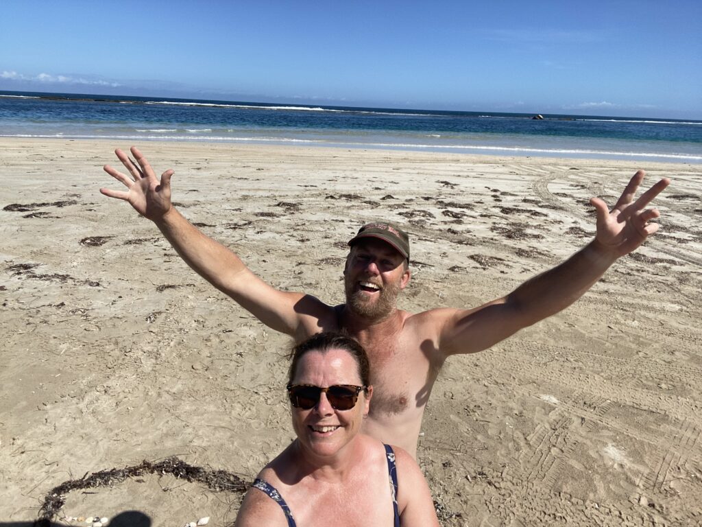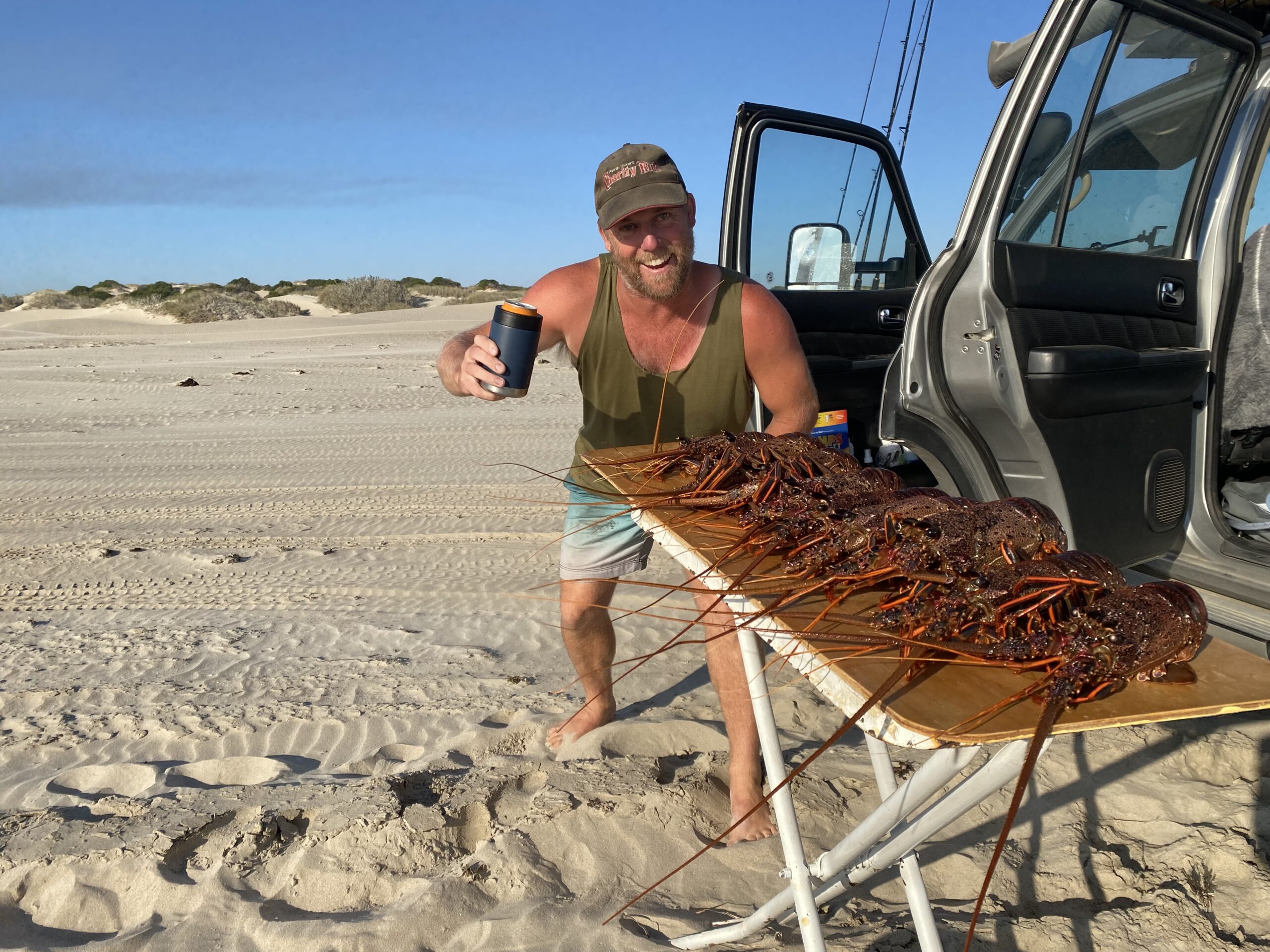 When we arrived we let the car tyres down. We thought we’d go into a spot just near where we have camped before. Unfortunately for us, I was driving and turned on the traction control (BIGGEST mistake in the world) the car & van got a bit bogged. We spent the next hour digging it out just like the ‘hopefuls’. I think we might have lost a bit of weight with all that digging. We decided the sand was probably a bit too soft to stay there anyway, so we reversed back into last year’s spot. After leveling up and unhooking, we drove to the beach for a well earned swim. Pete snorkeled out and got a cray for dinner.